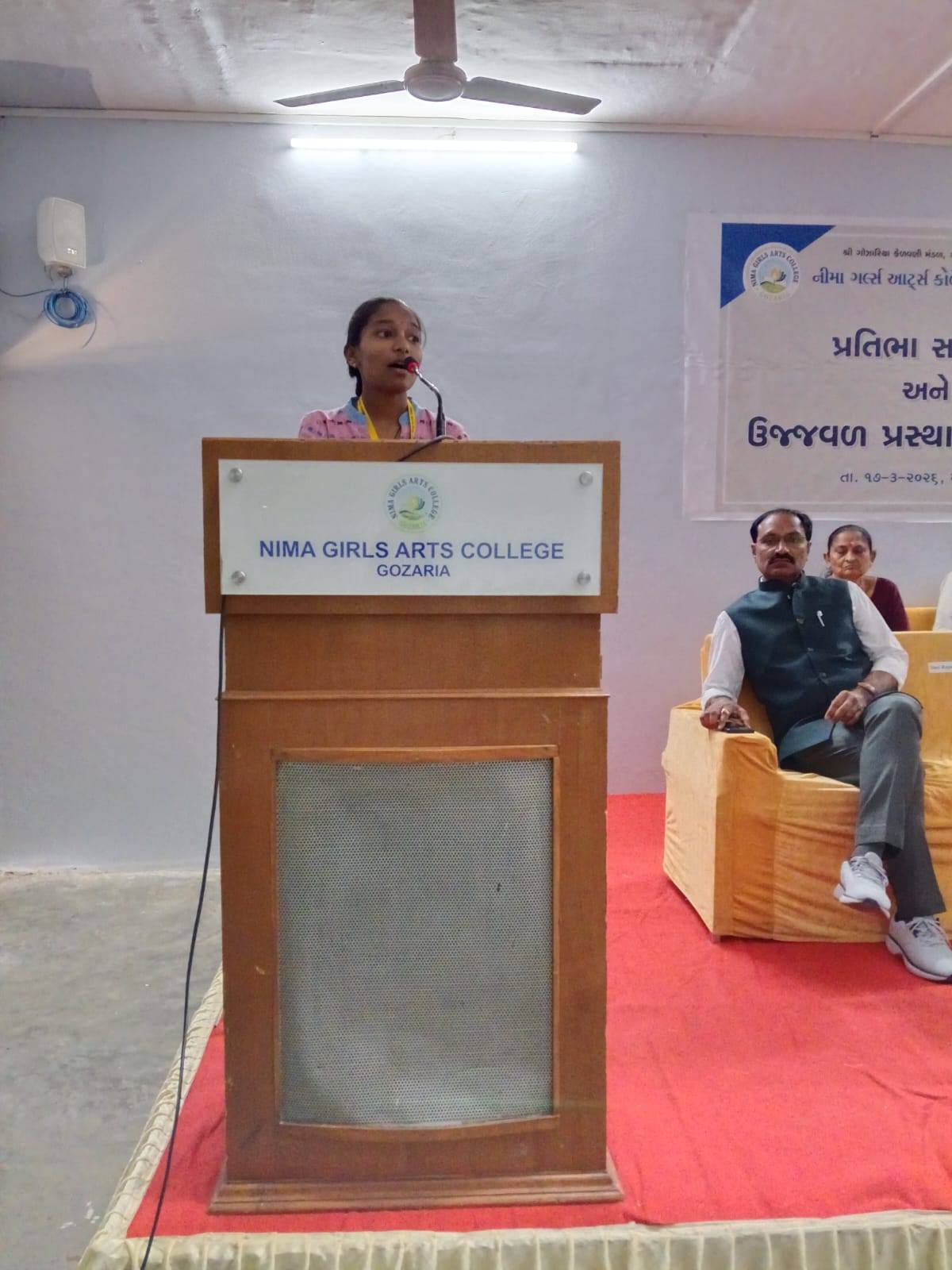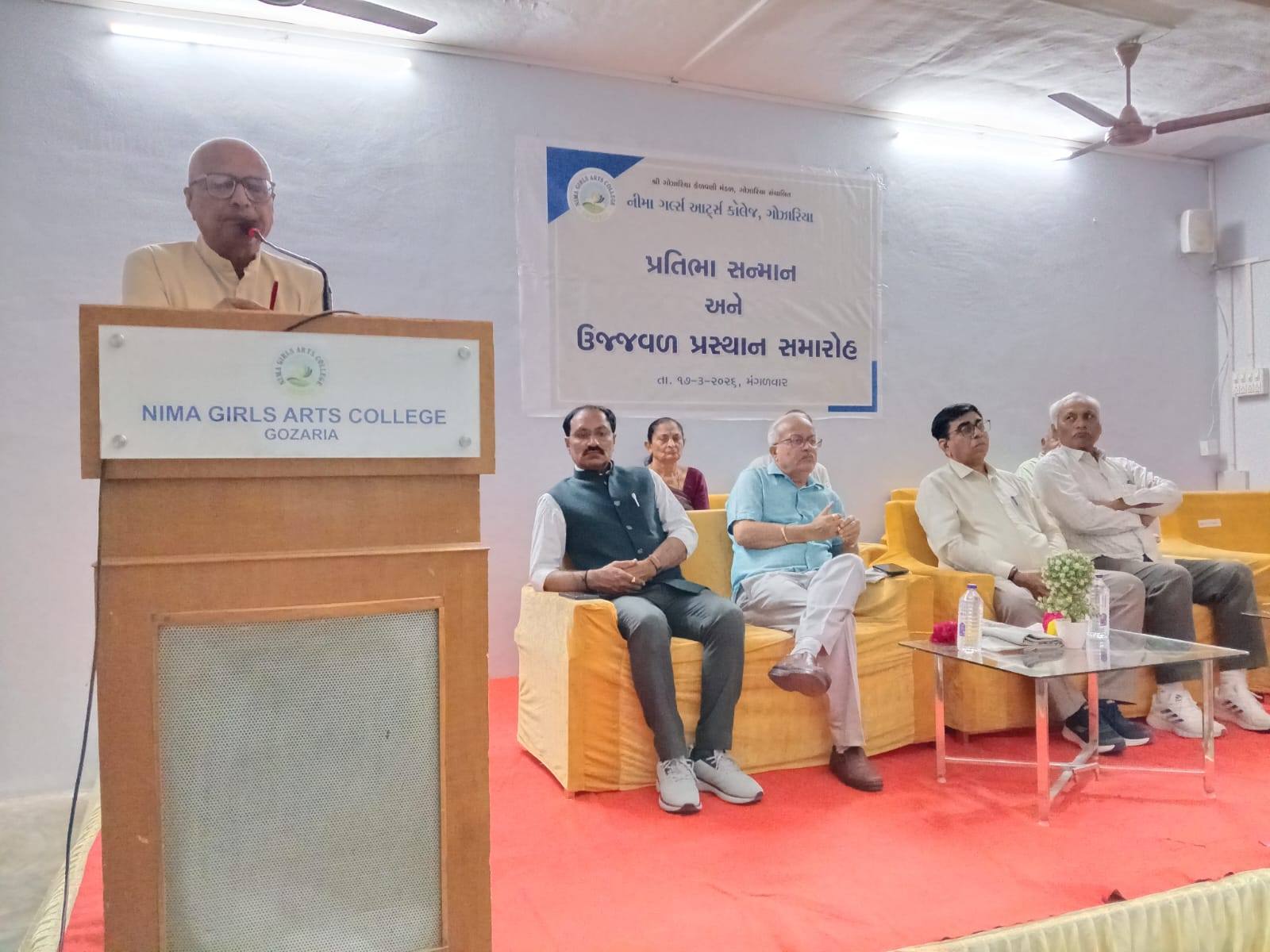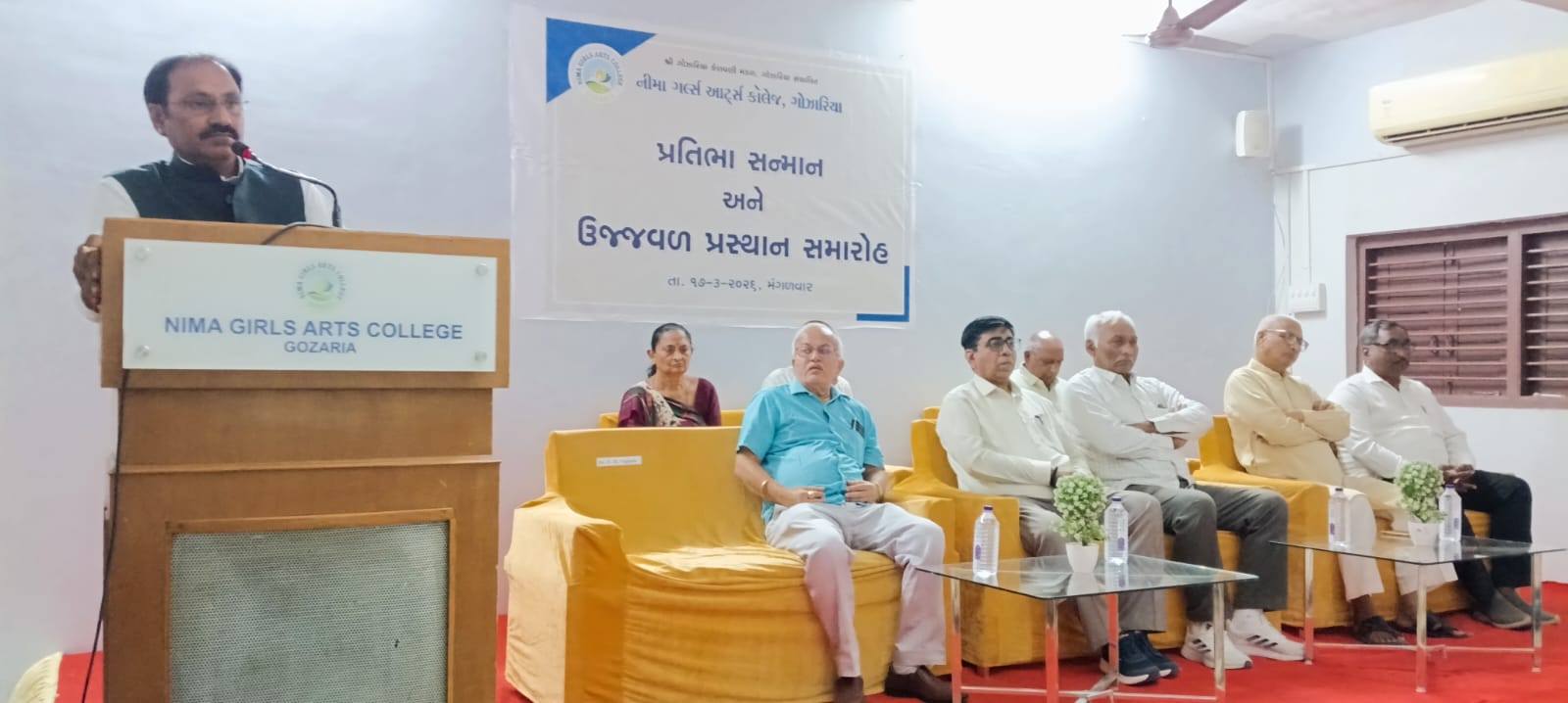 Nima Girls Arts College, Gozaria celebrated the felicitation and farewell function of the outgoing students of B.A. Sem. VI on March 17, 2026 under the heading “PRATIBHA SANMAAN ANE UJJVAL PRASTHAN.” The programme got off the mark with the prayer to the Almighty after which the energetic principal of the college Dr. Dharmendrasinh. Vaghela M. Vaghela introduced the honourable guests and wished the students for the most dazzling future of students. The inaugurator and the chairman of the Executive Committee of Shree Gozaria Kelavani Mandal remembered the struggling days of the opening of the college and congratulated the college-teachers for the better result of the girl-students of college. The various college-teachers such as Dr. S.G. Patel, Dr. Harshaben Patel, Dr. Tushar Pandya and Dr. Dipak Sondarava who were felicitated by different organizations were also felicitated by the office-bearers of Shree Gozaria Kelavani Mandal. During the programme the retired peon Mrs. Manjulaben B. Kadiya was also felicitated warmly. The outgoing girl-student Divya Thakor expressed her thankfulness to the institute and Rajvi Patel of B.A.-IV and Shweta Vaghela of B.A.-II and Dr. Tushar Pandya expressed his feelings for the outgoing students. The chief guest of the function and the honourable registrar of Hemchandracharya North Gujarat University, Patan delivered about the multifarious opportunities offered to the students of the higher education as part of NEP 2020. He also congratulated the teaching-staff for their devotion and dedication. The guest of honour and trustee of Shree Gozaria Kelavani Mandal Shree Rajubhai Pandya express the indomitable resolve of the statutory body of the management towards the higher education of the girls of the nearby area. As part of the “PRATIBHA SANMAAN ANE UJJVAL PRASTHAN” the girl-students, having attained ranks in the educational and the co-curricular activities, were also felicitated by the dignitaries. The entire function was meticulously anchored by Prof. Tarun Raval and the vote of thanks was offered by Dr. Dipak Sondarava. At the end of the programme everybody enjoyed the food offered by Prin. Dharmendrasinh M. Vaghela. The encouraging presence of the outgoing girl-students and their firm devotion towards career remained the special attraction, which left the indelible impression in the heart of everybody present during the function.