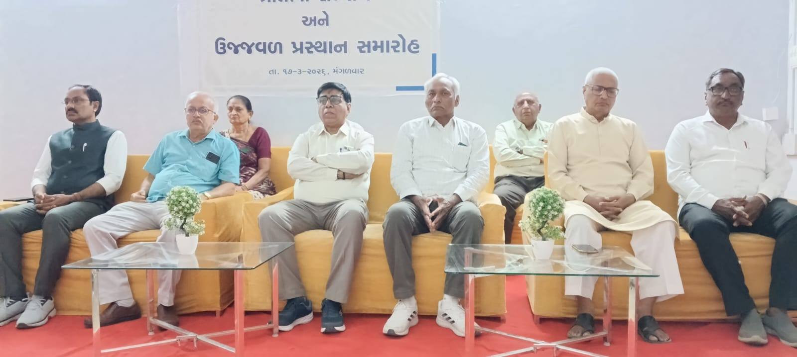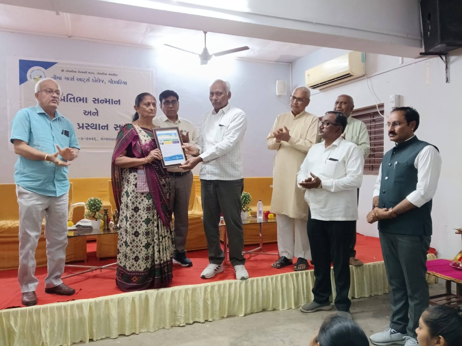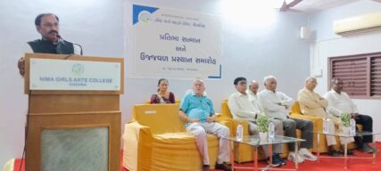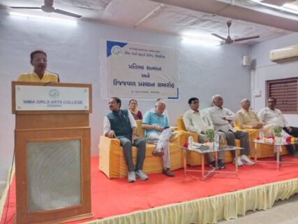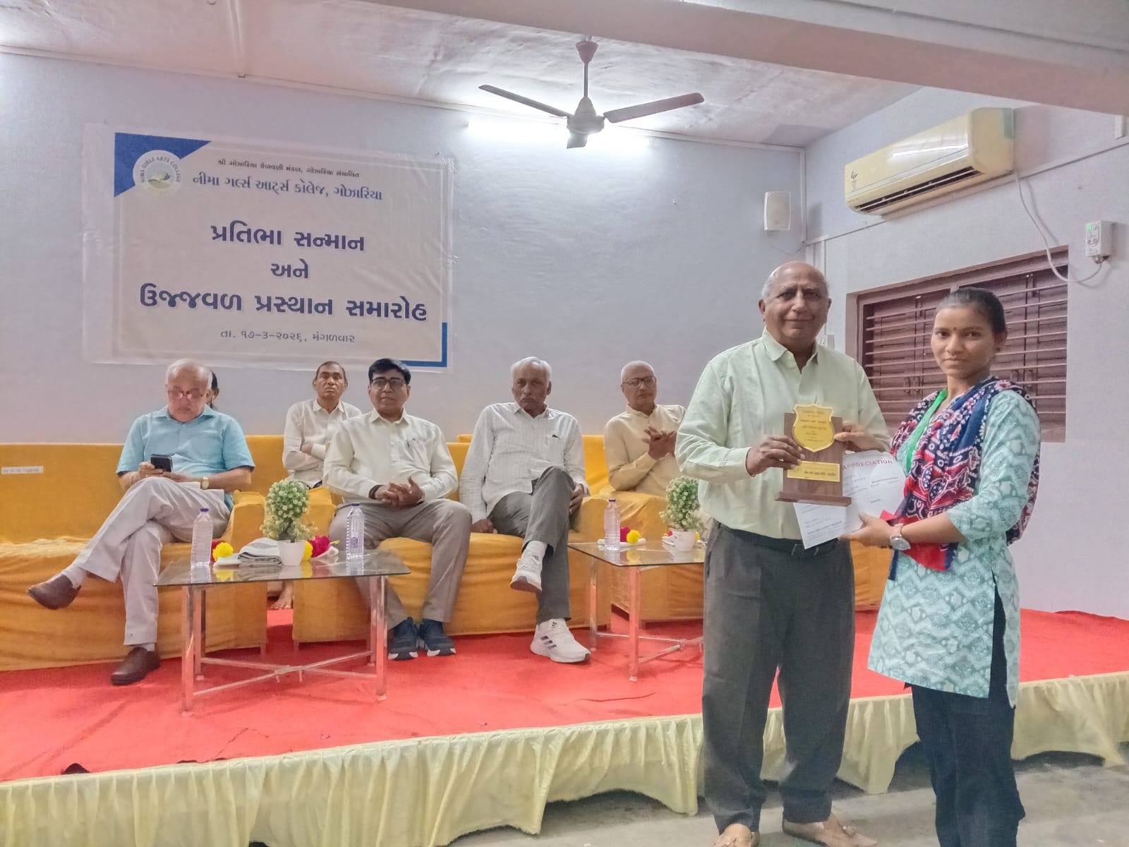 Nima Girls Arts College, Gozaria celebrated the felicitation and farewell function of the outgoing students of B.A. Sem. VI on March 17, 2026 under the heading “PRATIBHA SANMAAN ANE UJJVAL PRASTHAN.” The programme got off the mark with the prayer to the Almighty after which the energetic principal of the college Dr. Dharmendrasinh. Vaghela M. Vaghela introduced the honourable guests and wished the students for the most dazzling future of students. The inaugurator and the chairman of the Executive Committee of Shree Gozaria Kelavani Mandal remembered the struggling days of the opening of the college and congratulated the college-teachers for the better result of the girl-students of college. The various college-teachers such as Dr. S.G. Patel, Dr. Harshaben Patel, Dr. Tushar Pandya and Dr. Dipak Sondarava who were felicitated by different organizations were also felicitated by the office-bearers of Shree Gozaria Kelavani Mandal. During the programme the retired peon Mrs. Manjulaben B. Kadiya was also felicitated warmly. The outgoing girl-student Divya Thakor expressed her thankfulness to the institute and Rajvi Patel of B.A.-IV and Shweta Vaghela of B.A.-II and Dr. Tushar Pandya expressed his feelings for the outgoing students. The chief guest of the function and the honourable registrar of Hemchandracharya North Gujarat University, Patan delivered about the multifarious opportunities offered to the students of the higher education as part of NEP 2020. He also congratulated the teaching-staff for their devotion and dedication. The guest of honour and trustee of Shree Gozaria Kelavani Mandal Shree Rajubhai Pandya express the indomitable resolve of the statutory body of the management towards the higher education of the girls of the nearby area. As part of the “PRATIBHA SANMAAN ANE UJJVAL PRASTHAN” the girl-students, having attained ranks in the educational and the co-curricular activities, were also felicitated by the dignitaries. The entire function was meticulously anchored by Prof. Tarun Raval and the vote of thanks was offered by Dr. Dipak Sondarava. At the end of the programme everybody enjoyed the food offered by Prin. Dharmendrasinh M. Vaghela. The encouraging presence of the outgoing girl-students and their firm devotion towards career remained the special attraction, which left the indelible impression in the heart of everybody present during the function.