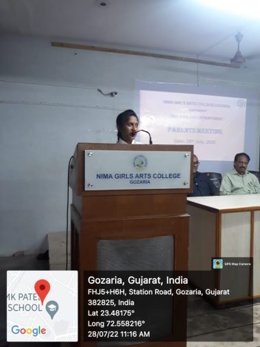 Nima Girls Arts College, successfully managed by shree Gozaria Kelavani Mandal Gozaria , organized the Parents’ Meeting in a very lively manner on July 28, 2022 in which as many as 47 parents of the current students remained present. Following our traditional convention the programme got off the mark with an auspicious prayer addressed to Father, Mother and Teacher, All the parents and honourable guests were orally welcomed by in-charge Principal Dr. R.D. Vaghela , who, in his welcome speech remembered the initial days of the institution twenty-five years back. Dr. S.G.Patel delivered about the expectations of society from Parents-Students and Teachers and also from their mutual closeness of relationship. Dr. V.M. Chauhan delivered about the dazzling achievements of the college throughout the twenty-five years gone by. Dr. H.M.Patel delivered about the role of healthy parents-students relation in achieving good results not only in the academic world , but also in the social world too. The well-established former students of the college revealed their emotional bond with the college. The representative of the trustee board of Shree Gozaria Kelavani Mandal and retired head-master of the Union Highschool Langhnaj spoke about the purpose of starting a Girls College in Gozaria i.e. to develop the aspects of civility and compassion in the coming generation. This programme was also graced by the director of the JSMP Education campus Shree N.K.Patel and the head-masters of the sister institutions under the flag of Shree Gozaria Kelavani Mandal, Gozaria. This programme was anchored successfully and the Vote of Thanks was rendered by Dr. D.M.Vaghela. At the end of the programme the gathering got dispersed after taking the meal offered by a donor from the neighbouring village.